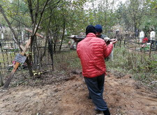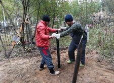 На данном участке изначально присутствовал только простой бетонный памятник и металлическое ограждение. Нам же необходимо было привести территорию могилы в полный порядок. Приступая к работе, мы первым делом вкручиваем определяющие фундамент сваи.