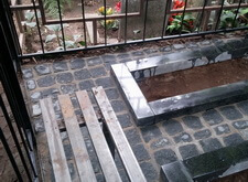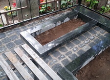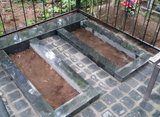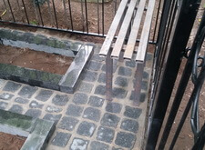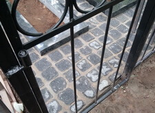 После покраски ограды устанавливаем подставку под памятники с цветниками, лавочку и укладываем пол гранитной брусчаткой.