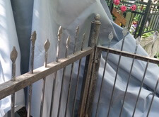 Это старая и мощная ограда. По словам клиентов ей более 60 лет. Достаточно длительный срок нижняя часть ограды находилась в земле, это ускорило коррозию металла, некоторые прутья разболтались, и задняя часть ограды провисла. Необходимо было отремонтировать ограду и покрасить ее.