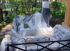 Так выглядело место захоронения на момент окончания работы: деревянный крест покрыт защитным раствором; мраморные изделия отшлифованы и покрыты гидрофобной субстанцией, стыки элементов промазаны белым герметиком; полые столбики, восстановлены; в цветнике заменена земля и посажен газон.